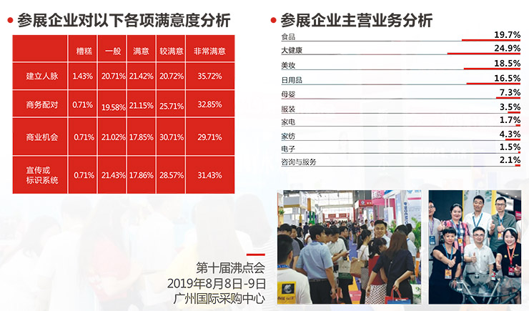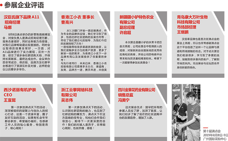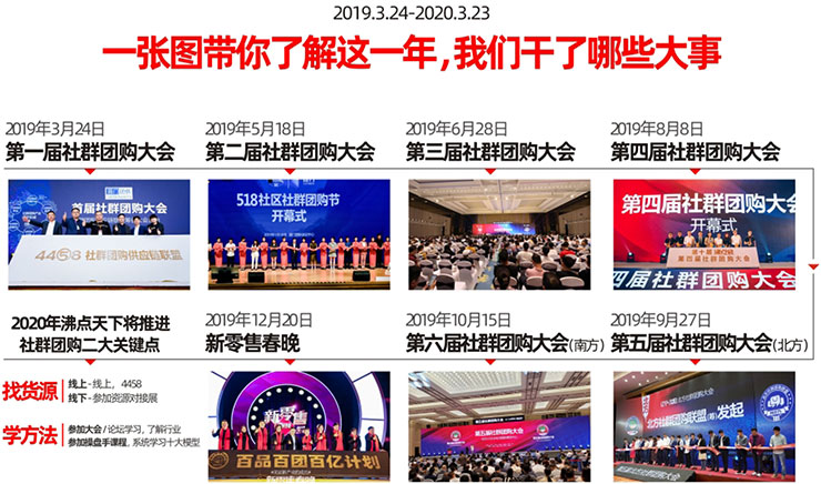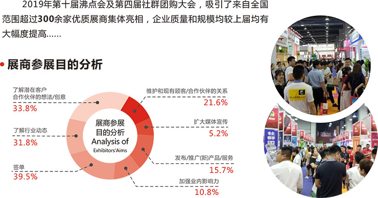 會+展總覽 隨著《中華人民共和國電子商務法》的出臺和實施,中國新零售市場正處于蓬勃發展階段,預計今后的數年仍將保持上揚趨勢;社群團購、微商、社交電商成為中國新零售渠道占領市場的重要因素之一。在這一大趨勢下,第四屆社群團購大會與第十屆沸點會首度以【會+展】模式在2019年達到了空前規模,于2019年8月8日-9日在廣州國際采購中心召開,深度鏈接沸點天下五年來沉淀的全方位資源。從平臺品牌系統、供應鏈系統、運營系統衍生社群團購基本邏輯,串聯成一完整的社群團購產業鏈年度盛會。
