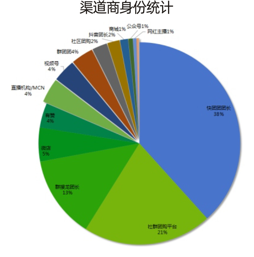 快團團團長38.3%;社群團購平臺20.61%;群接龍團長13.20%;微店13.20%;有贊(群團團團長未包含在內)3.92%
